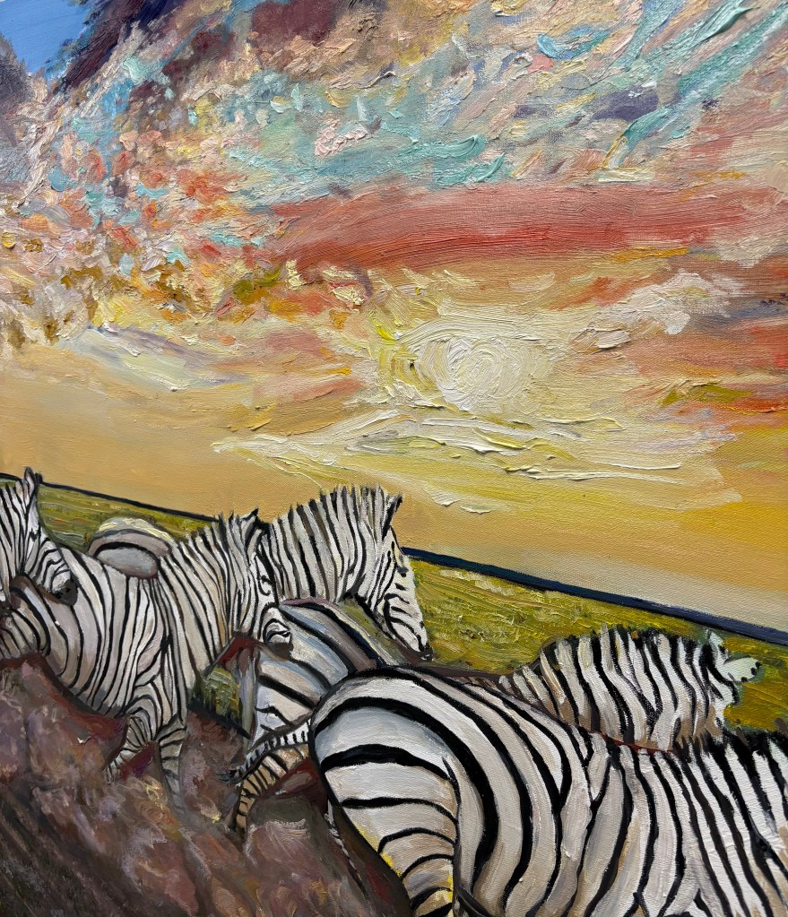 My work recognizes the simultaneity in every organism that goes unspoken. I paint nature’s raw beauty and innocence. Growing up an only child in Ocean City, Maryland made me appreciate the power of being around life by the sea, the ecosystem is peaceful, quiet and content with what they have. I relate to these animals to myself, by choosing a singular animal to paint I am pointing out its self standing beauty, the power of being on your own. A pack of animals are like a cluster of trees, all are equal, one is not more important than the other in a group, they all come together with the same movements or repitition that create a balanced composition. I like to paint about the synchronicity in nature, how its perfect geometry blows in the wind, why each hair is perfect and parralel to the other. I love patterns on animals and in nature, its fun to single out an organism and brighten it more, or try and recreate the straightest line on a building 60 times.